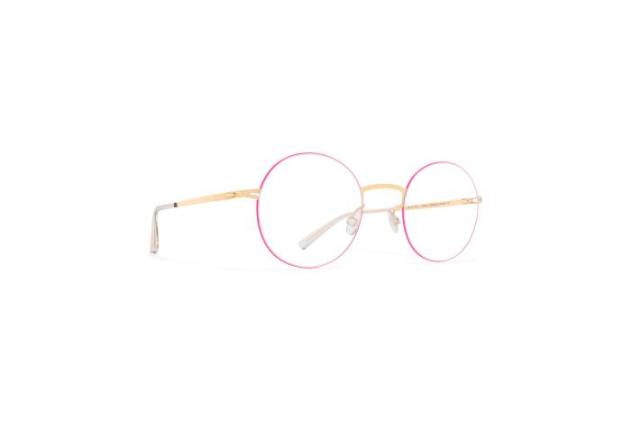 Lavet Af Ultra Let Rustfrit Stål, Kayo I Guld/neon Pink Med Klare Linser Er En Rund Formet Optisk Ramme Fra Mykita Lessrim Kollektionen. Kun 0,5 Millimeter Bred, Ligger Den Rustfri Stålkant Flugt I Rillen På Linsens Omkreds. Håndlavet I Berlin.